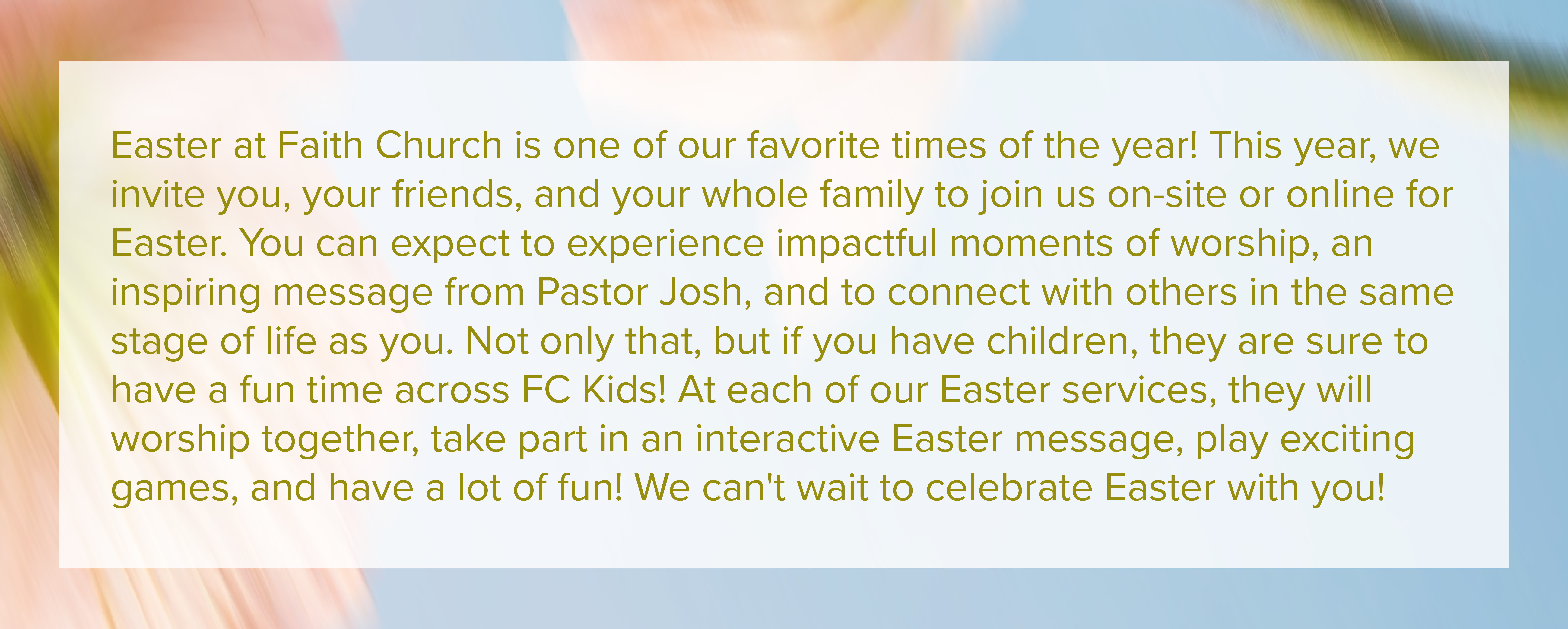 New to Faith Church? That’s great! We know it can be difficult trying out a new place on Easter. We’d like to do everything we can to get you the answers you’re looking for. A great place to start is our Plan My Visit page you’ll find helpful information about each of our campus locations in Oklahoma City and Hinton.